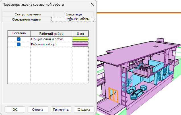 "Параметры экрана совместной работы". В модели отображается указанный цвет для соответствующего рабочего набора.