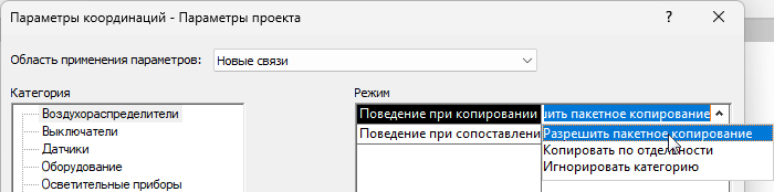 Перед копированием приборов из связанной модели в модель MEP или непосредственно в процессе копирования следует задать в диалоговом окне «Определение параметров координации» режим копирования для каждой категории приборов.