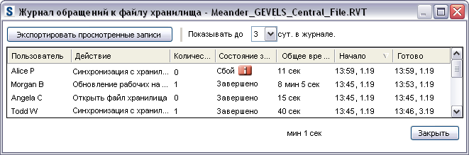 В диалоговом окне "Журнал" отображаются сведения обо всех операциях обращения к файлу хранилища для проекта Revit. При ошибке операции обращения к файлу хранилища щелкните