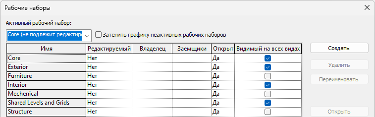 При создании рабочего набора можно в диалоговом окне "Новый рабочий набор" установить или снять флажок "Видимый на всех видах", определяющий режим отображения данного рабочего набора на всех видах модели. Эта настройка отражена в столбце "Видимый на всех видах" диалогового окна "Рабочие наборы".