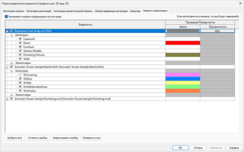 Можно назначить цвет каждой категории элементов модели координации в настройках видимости/графики для мгновенного распознавания категории. Эта функция применяется к моделям координации, связанным с Autodesk Docs.