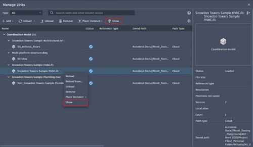 Можно нажать кнопку «Показать» в верхнем меню диалогового окна «Диспетчер связей», чтобы найти и просмотреть модели координации непосредственно в рабочей области Revit. При связывании файлов Navisworks эта функция применяется к моделям координации, связанным с файлами Autodesk Docs (RVT, DWG, IFC, NWC, AXM и т. д.), а также с локальным хранилищем.