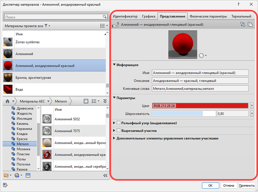 В Обозревателе материалов эти сведения отображаются на вкладках "Идентификация", "Графика" и "Внешний вид" панели "Редактор материалов".