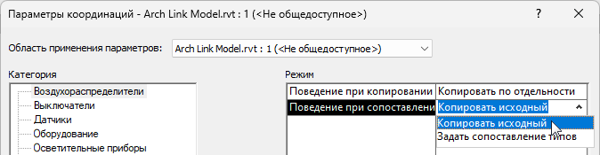 Перед копированием приборов из связанной модели в модель MEP или непосредственно в процессе копирования следует задать в диалоговом окне «Определение параметров координации» режим сопоставления для каждой категории приборов.