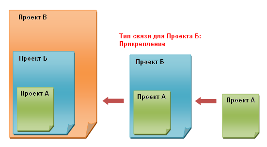 При изменении типа связи для проекта A на "Прикрепление" (в его родительской модели, проекте B) при импорте проекта B в проект C вложенная связь (проект A) будет отображаться.