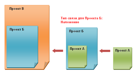 На следующей иллюстрации проект A представляет собой связанный проект в составе проекте B (т. е. проект В является родительской моделью для проекта A). Для проекта A параметру "Тип связи" в родительском проекте (проект B) присвоено значение "Наложение". При импорте проекта B в проект C проект A не отображается.