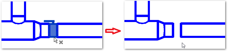 - При удалении встроенного элемента, такого как клапан или демпфер, воздуховоды и трубопроводы автоматически соединяются повторно. Используйте команду Обрезать/Удлинить для повторного соединения двух сегментов воздуховода или трубопровода.
