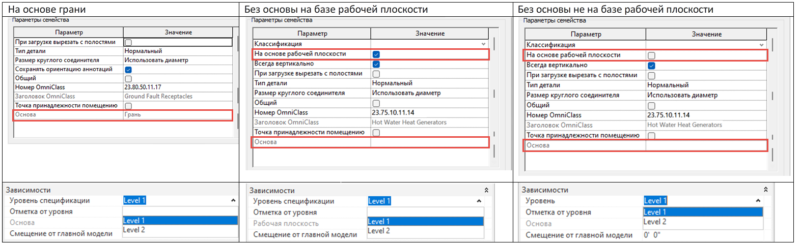 Если элементы размещаются на основе рабочей плоскости, параметр «Отметка от уровня» всегда доступен для редактирования. При этом не имеет значения, где размещены элементы — на вертикальных или невертикальных рабочих плоскостях.