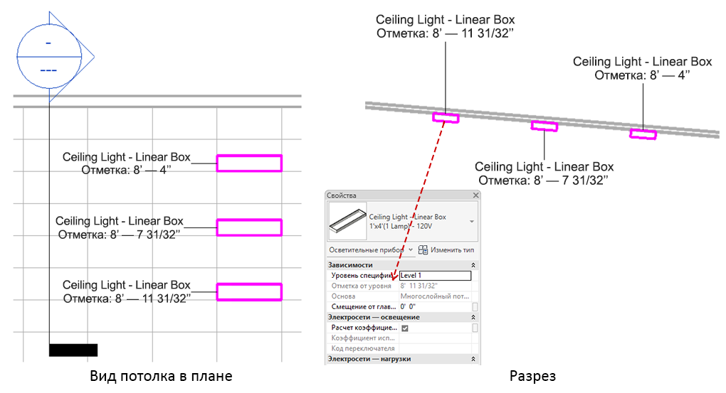 При изменении значения «Отметка от уровня» на 3' 0" или значения «Смещение от основы» на 1' 0" получаем тот же самый результат, так как значение одного параметра обновляется в зависимости от другого.