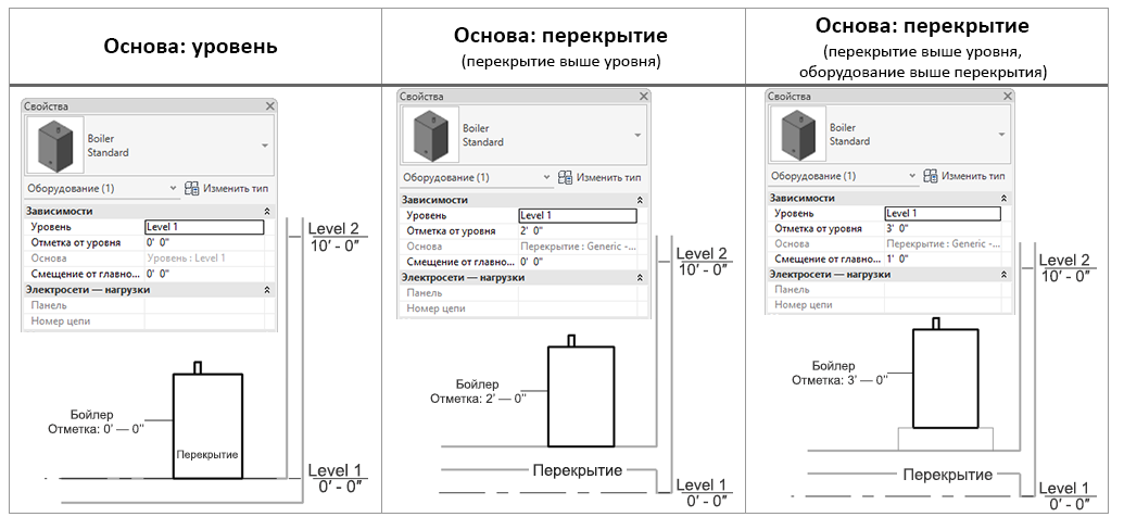 В примере ниже пол находится на высоте 2' 0" над уровнем. Когда бойлер размещается на полу, параметр «Отметка от уровня» будет иметь значение 2' 0", а «Смещение от основы» — 0' 0".