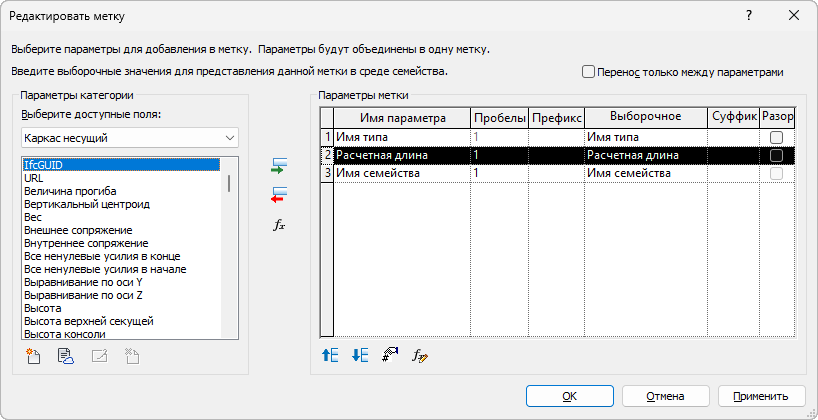 В диалоговом окне редактирования метки можно назначить метке один или несколько параметров.