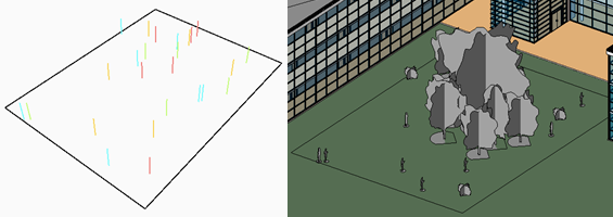 С помощью этого примера типов исследований модуля Генеративное проектирование в Revit можно создавать альтернативные варианты размещения объектов в определенном пространстве, например деревьев в парке или людей в здании.