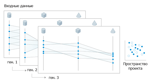 Генеративное проектирование позволяет сформировать результаты на основе зависимостей, определенных типом исследования, с использованием случайных значений в пределах заданных диапазонов для указанных переменных. В результате создается массив возможных решений, представляющих случайную выборку значений переменных.
