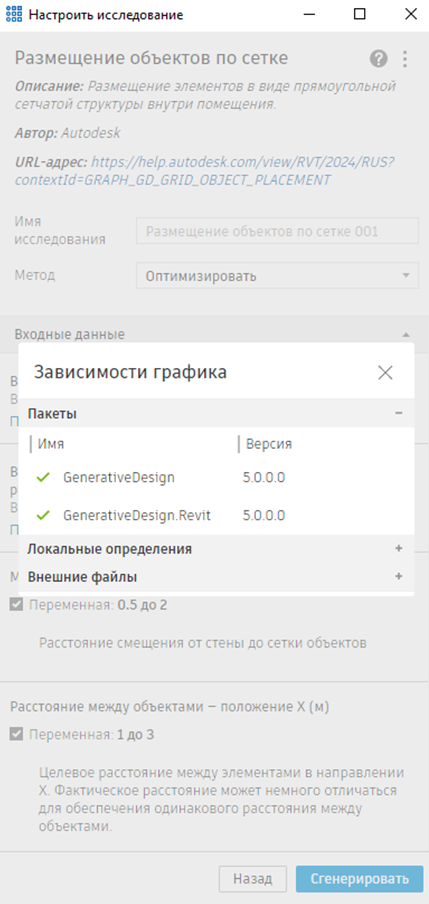 Для работы в модуле Generative Design в Revit для графика Dynamo, на основе которого создается тип исследования, могут потребоваться определенные зависимости, например пакеты, пользовательские узлы или внешние файлы. Диалоговое окно «Зависимости графика» позволяет быстро определить, какие пакеты и другие зависимости требуются для правильной работы графика, а также выявить отсутствующие зависимости, которые можно установить в Dynamo.