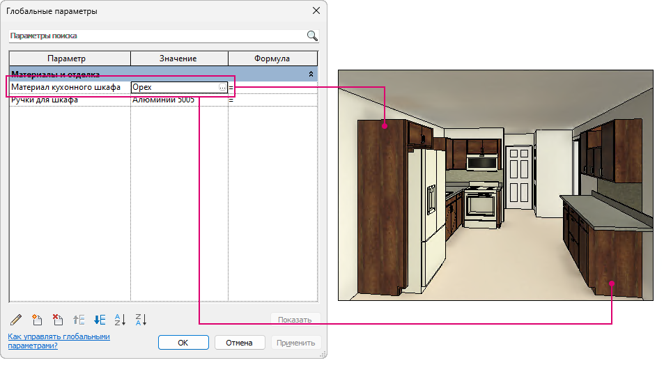 Чтобы изменить значение вновь созданного глобального параметра, перейдите на вкладку «Управление» панель «Параметры» (Глобальные параметры). Выберите другой материал, и он будет применен к шкафам на кухне. Больше не требуется изменять параметры типа для каждого семейства по отдельности.