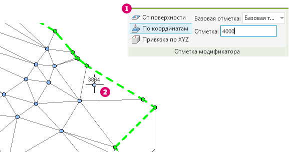 При добавлении точек во время редактирования формы используйте параметр «Базовая отметка», чтобы определить относительную отметку точки. Можно выбрать создание отметок от текущего уровня, базовой точки проекта, точки съемки и внутреннего начала координат. Можно определить, будут ли точки добавлены в абсолютной отметке от выбранной базы отсчета или смещены на заданное расстояние от существующей поверхности.