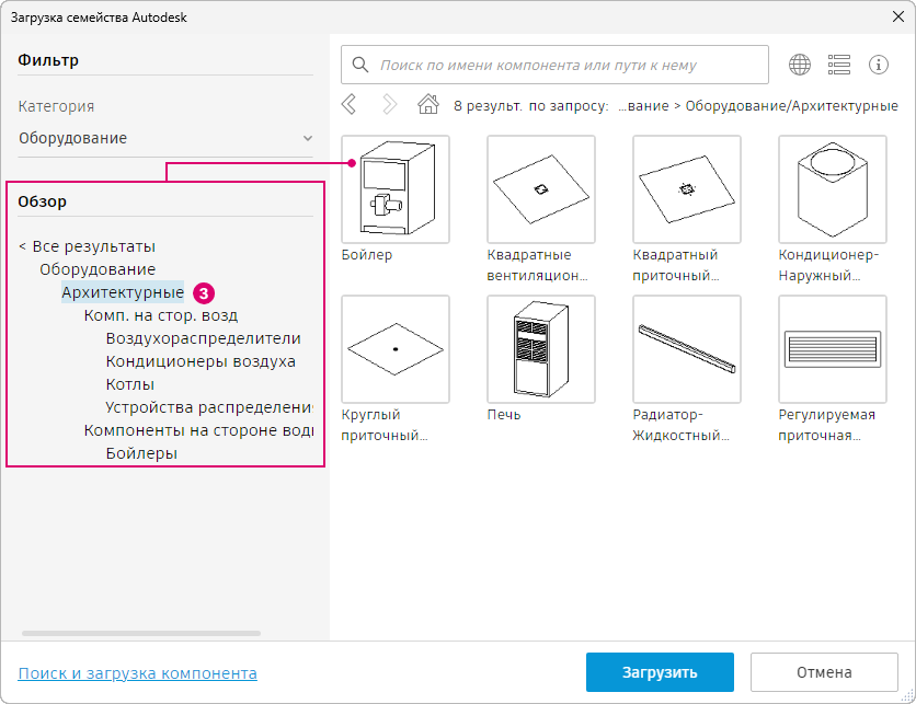 Когда нужное семейство найдено, его можно загрузить в проект. Для этого выберите семейство в обозревателе семейств и нажмите кнопку «Загрузить» в нижней части окна. Выбранное семейство загружается в активную модель Revit, и обозреватель закрывается. Для загрузки другого семейства повторите эту процедуру.