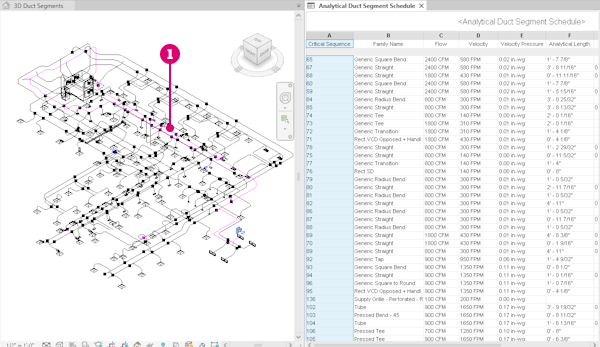 Создайте спецификацию сегмента воздуховода аналитической модели, чтобы отобразить параметры потока и падения давления для каждого сечения. Отфильтруйте спецификацию по идентификатору сети и важнейшей траектории для выделения важнейшей траектории сети воздуховодов