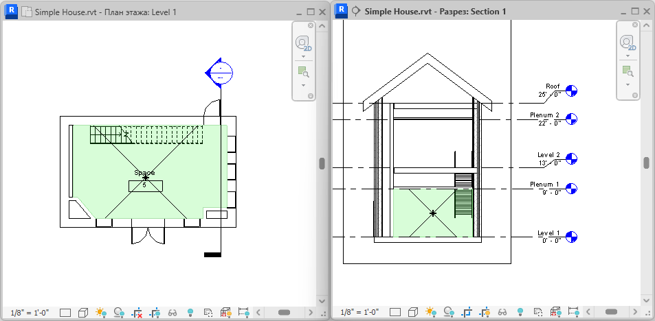 1. Закройте все виды, кроме разреза и плана этажа, на котором требуется разместить пространство, и наберите на клавиатуре w t для расположения этих двух видов без перекрывания.