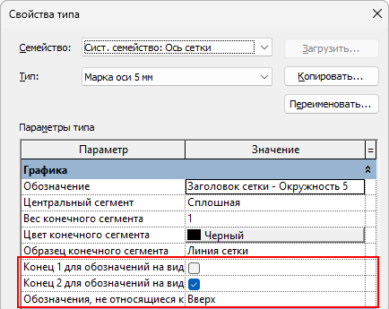 - Установите флажок "Конец 1 для обозначений на виде в плане (по умолчанию)", если марка должна отображаться в начале оси на плане.