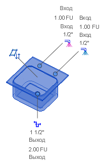 Каждый соединитель системы имеет метку и выноску, в которых отображаются тип системы и данные соединителя, как правило, размер, направление потока и значения потока/расход прибора.
