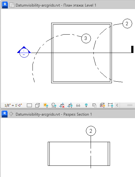 Например, на следующем плане этажа построены 2 дуговые координационные оси. Линия сетки 3 пересекает линию разреза, но касательная к ней, проходящая через центральную точку, не перпендикулярна линии разреза. Как следствие, линия сетки 3 не отображается на разрезе. Линия сетки 2 пересекает линию разреза на плане этажа, а касательная, проходящая через центральную точку, перпендикулярна к линии разреза. Поэтому линия сетки 2 отображается на разрезе, указывая центр дуги.