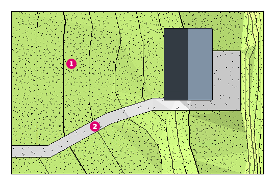 Отображение горизонталей на элементах топотела определяется свойствами типа. Это позволяет использовать различные элементы топотела для представления различных элементов площадки в проекте. Например, один тип топотела представляет общие условия площадки и отображает информацию о горизонталях