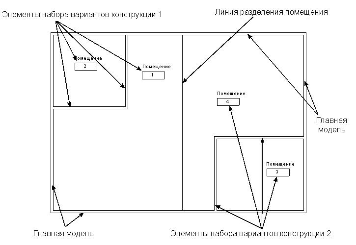 Если в разных вариантах конструкции комната имеет одну и ту же форму, размер и расположение и, кроме того, для этой комнаты во всех вариантах назначены одинаковые свойства, ее следует включить в главную модель.