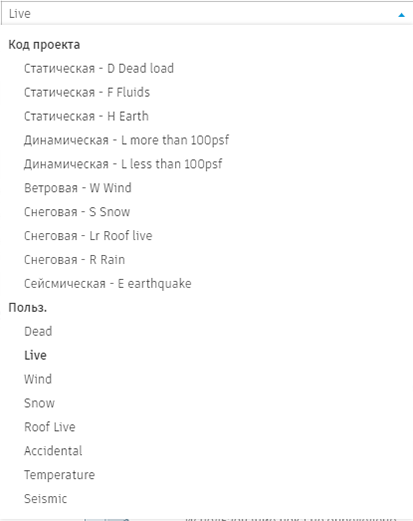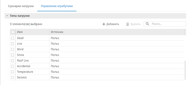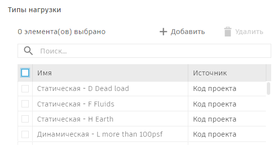 Типы нагрузок, добавленные вручную, будут по-прежнему доступны. Они отличаются от тех, которые содержатся в нормах проектирования, атрибутом «Источник», указанным во втором столбце таблицы: «Код проекта» или «Пользовательский».