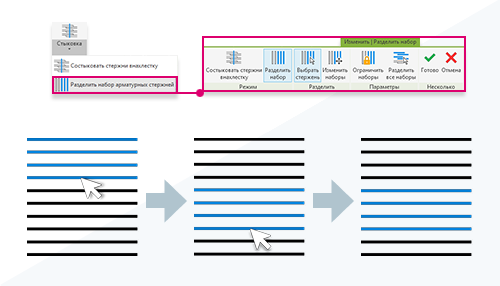 Можно разделить один или несколько наборов арматурных стержней в выбранном положении стержня или в пересекающей опорной линии.