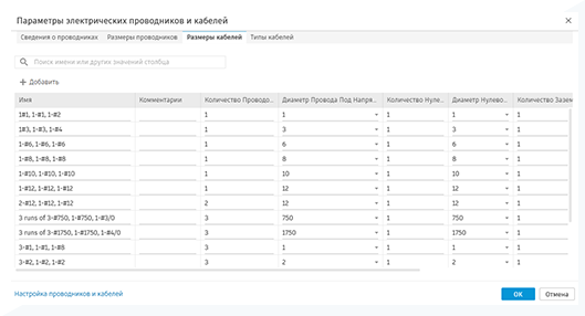 Электрические проводники и кабели поддерживают адаптацию. В новом окне «Настройки проводов и кабелей» можно настроить определения проводников, а затем использовать эти определения в размерах и типах кабелей. Затем эти типы кабелей назначаются цепям в моделях.
