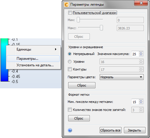 Глобальные результат отражается в легенде в графическом окне. Изменение единиц Легенды изменяет единицы вывода при расследовании.