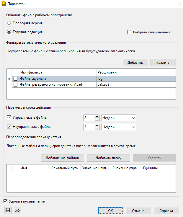 Пользователь может указать, какие типы файлов, не управляемых Vault, автоматически удаляются из рабочего пространства. Файлы в рабочей папке, расширение которых совпадает с указанным, будут удалены при синхронизации. Имеются два фильтра, отключенные по умолчанию: «Файлы журналов (LOG)» и «Файлы резервных копий Acad (BAK, AC$)».