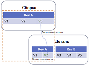 Рассмотрим простой пример: сборка находится в редакции А, а деталь — в редакции B.