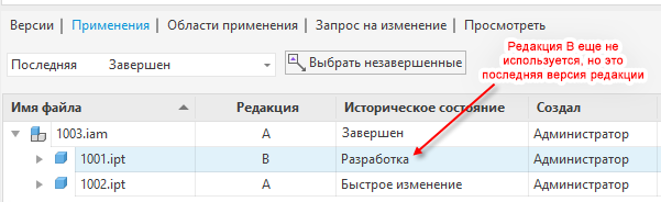 , на вкладке «Применения» отображается последняя версия файла. Он показывает текущий этап работы над всеми компонентами и подчиненными компонентами.