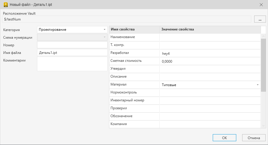 Диалоговое окно Data Standard для Vault доступно в Inventor и AutoCAD. При первом сохранении файла отобразится диалоговое окно Data Standard. Заполните обязательные и дополнительные поля, настроенные администратором, после чего нажмите «ОК», чтобы сохранить данные. Данные сохраняются в виде таблицы данных, которую впоследствии можно редактировать.
