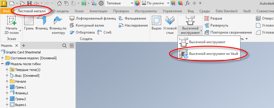На ленте перейдите на вкладку «Листовой металл» > «Высечной инструмент» и выберите «Высечной инструмент из Vault».