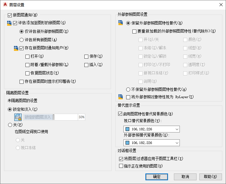 - 确定是仅当在外部参照图形中添加新图层时得到通知,还是当在外部参照图形和当前图形中添加新图层时得到通知: