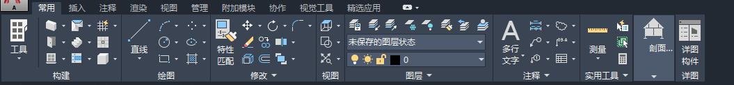 “常用”选项卡包含本软件中最常用的命令。在该选项卡中可以找到基本的对象和图形工具,以及修改工具、图层和基本符号标注等常用的实用程序。新图形使用“常用”选项卡作为起点。
