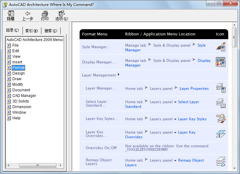 我的命令在哪里?工具是一个帮助文件,它可按照先前的菜单位置列出命令,并且显示这些命令在功能区中的当前位置。