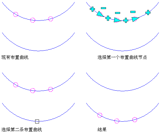 执行以下步骤可以将布置曲线从一个对象移动到另一个对象。在此操作中,布置模式将保持不变。如果原来以相等间距在布置曲线中插入节点,则在新对象上节点也将保持间距相等。