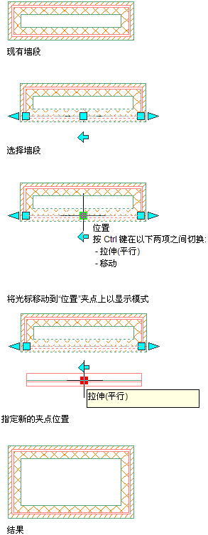 下图显示了如何在“拉伸(平行)”模式下使用“位置”夹点来移动连接的平行墙段,并保持相邻墙的连接。