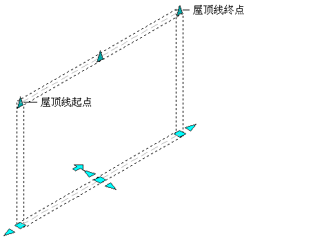 下图显示了为三维和二维视图中的直墙段显示的“屋顶起始线”和“屋顶端线”夹点。