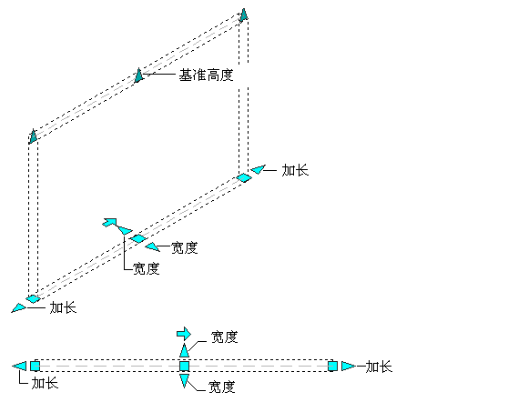 下图显示了为三维和二维视图中的直墙段显示的“拉长”、“宽度”和“基准高度”夹点。