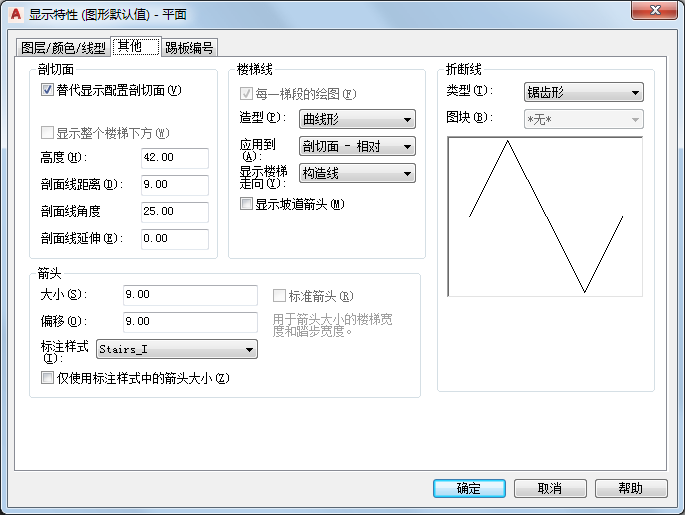 使用以下步骤可以指定单个楼梯的其他显示特性,例如,如何显示楼梯走向中的箭头、要显示哪个“显示楼梯走向”、以及在楼梯显示中要使用哪种类型的折断线。这些显示特性只应用于在图形的“俯视图”(平面图)中使用的显示模式(如“平面”)。