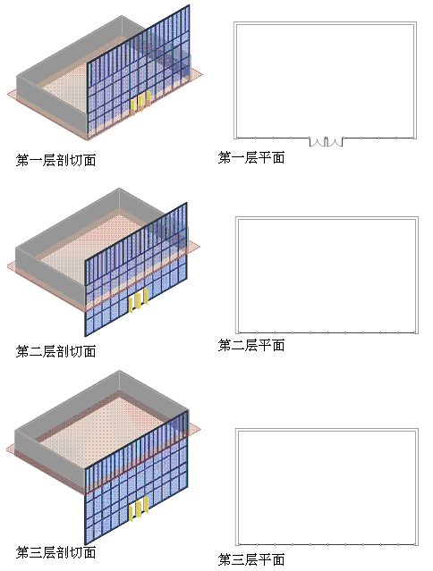 下图演示了一面跨越三层的幕墙。左边的图像表示关联层图形的剖切平面。右侧平面显示幕墙在各层的平面图中如何显示。请注意各楼层平面上门和竖梃在外观上的不同。