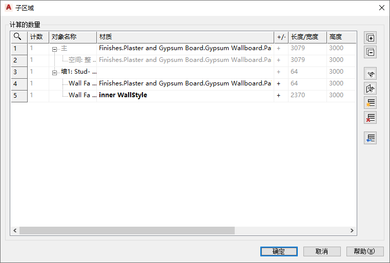 - 计算符号 +/- 显示是否从主区域中减去子区域(减号)或将子区域添加(加号)到主区域。自动检测到的子区域(如墙中的洞口)在默认情况下为减号 (-),这表示它们将从墙表面中减去,因为它们可降低材质需求。