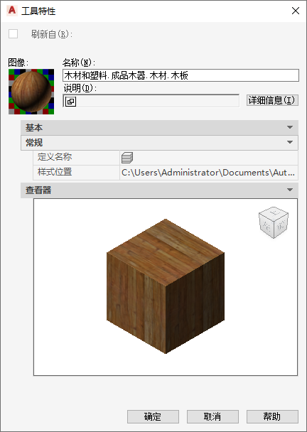现在,该材质工具会以 AutoCAD Architecture 2027 工具集 方块图标呈现在选项板中且显示正确的材质。