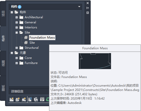 在“项目导航器”中,可以显示项目图形的缩略图预览。预览可以是图形或详图,也可以是此两者的组合。在浏览包含许多图形的大型项目时,显示缩略图可能会有帮助。
