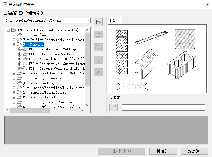 使用“详图构件管理器”对话框,可以在不同详图构件数据库之间导航。该对话框具有层次树状视图和过滤功能,可以简化在数据库中查找构件的操作。找到所需构件后,可将其插入到图形中,或者将其拖放到工具选项板中以便重复使用。请注意,除非您具有对选定数据库的编辑权限,否则在该对话框中间部分垂直排列的五个按钮将不可用。